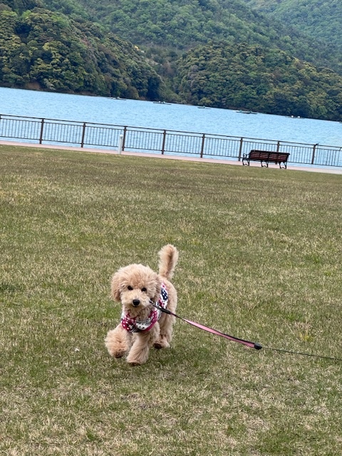 芝生公園 イベントやってる敷地には大きな芝生公園もあって、かなたの散歩にはうってつけ。かなたは、まだ散歩を楽しむ感じではないけど歩くのは嫌じゃないみたい。トイレも外では我慢しちゃうんだよね。これから徐々に散歩の楽しさ知ってくれるといいな(*^^*)